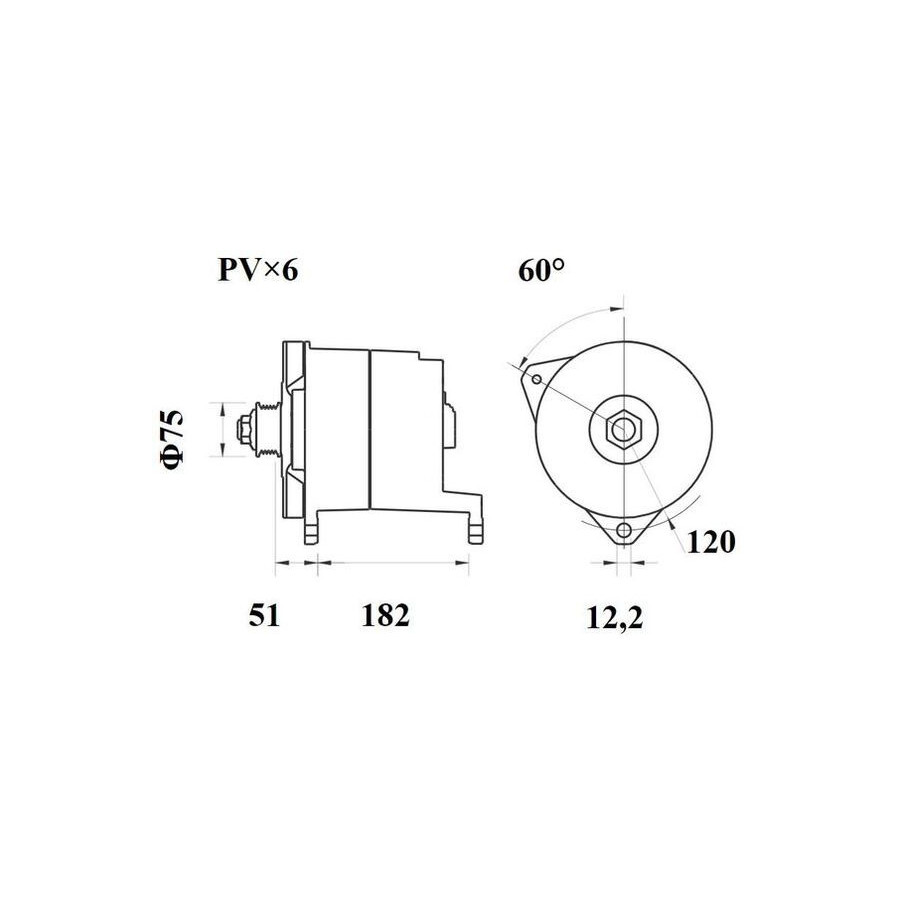 Voltage [V] 28 Number of Ribs 6 Alternator Charge Current [A] 200 Belt Pulley Ø [mm] 75 Pulleys With v-ribbed belt pulley Mounting points diameter [mm] 120,0 Mounting bores distance [mm] 182,0 Connector / Clamp W Distance from pulley to alternator [mm] 51,0 Rotation Direction Clockwise rotation Packaging length [cm] 40,0 Packaging width [cm] 25,70 Packaging height [cm] 26,30 Warranty 2 years Dust Cover With dust cover Net Weight [g] 16107 Hole diameter [mm] 12,2 Similar products of other manufacturers