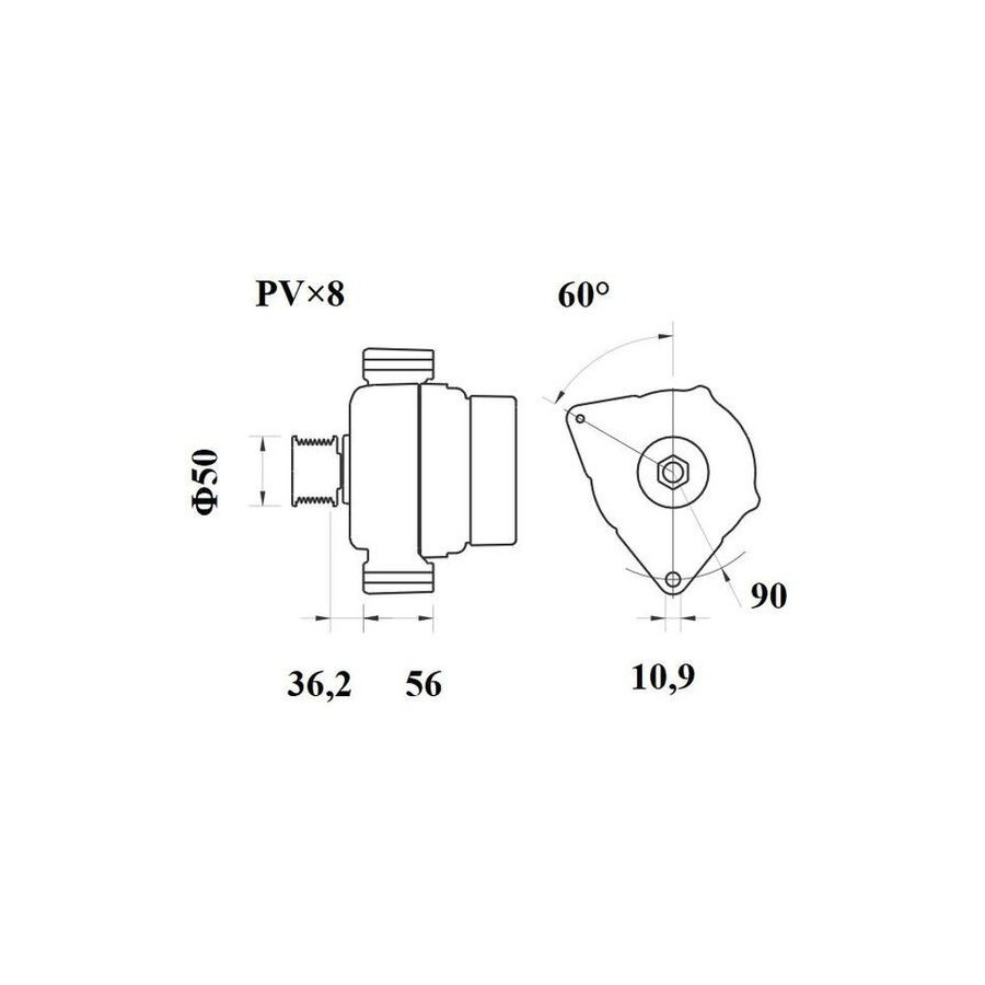 Voltage [V] 14 Number of Ribs 8 Alternator Charge Current [A] 170 Belt Pulley Ø [mm] 50 Pulleys With v-ribbed belt pulley Mounting points diameter [mm] 90 Mounting bores distance [mm] 56 Distance from pulley to alternator [mm] 36,2 Rotation Direction Clockwise rotation Alternator type Multi-function Packaging length [cm] 24,8 Packaging width [cm] 18,60 Packaging height [cm] 17,50 Warranty 2 years Connecting Angle [Degree] 60 Compact Alternator Net Weight [g] 7600 Hole diameter [mm] 10,9 Similar products of other manufacturers