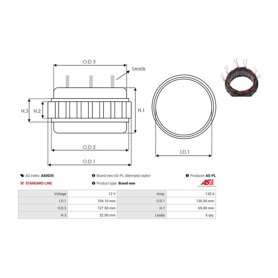 Voltage [V] 12 Alternator Charge Current [A] 120 Inner diameter [mm] 104,10 Outer Diameter 1 [mm] 127,50 Quality Standard line Warranty 2 years New part without deposit -