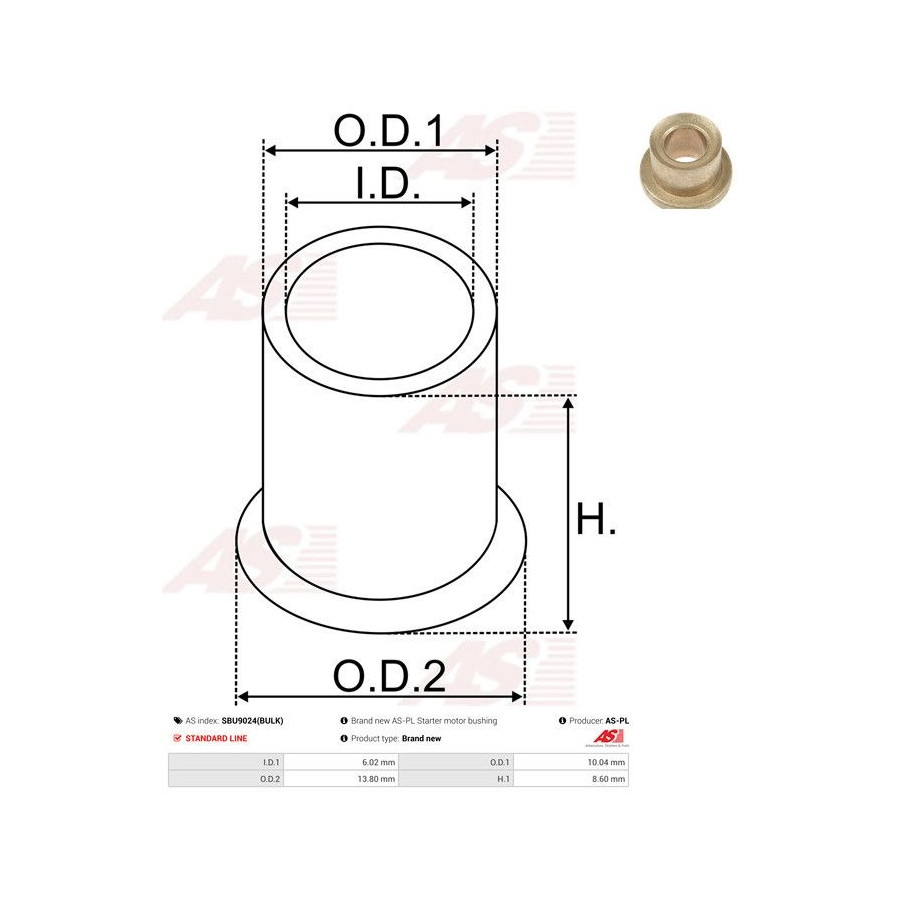 Inner diameter [mm] 6,02 Outer Diameter 1 [mm] 10,04 Outer diameter 2 [mm] 13,80 Quality Standard line Warranty 2 years Height [mm] 8,60 New part without deposit -