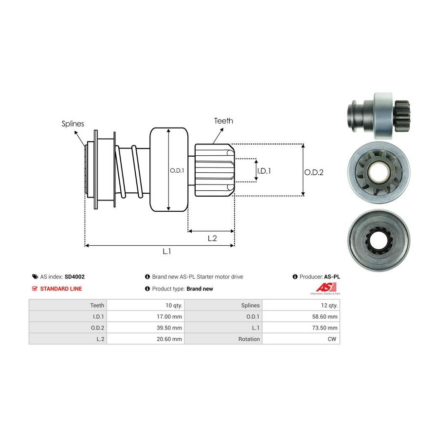 Inner diameter [mm] 17,00 Number of Teeth 10 Outer Diameter 1 [mm] 58,60 Outer diameter 2 [mm] 39,50 Quality Standard line Length 1 [mm] 73,5 Rotation Direction Clockwise rotation Warranty 2 years New part without deposit -
