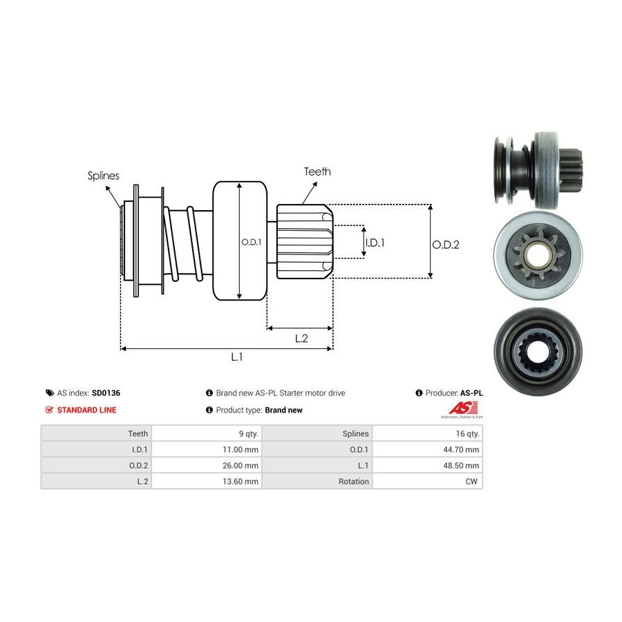 Inner diameter [mm] 11,00 Number of Teeth 9 Outer Diameter 1 [mm] 44,70 Outer diameter 2 [mm] 26,00 Quality Standard line Length 1 [mm] 48,5 Rotation Direction Clockwise rotation Warranty 2 years New part without deposit Similar products of other manufacturers