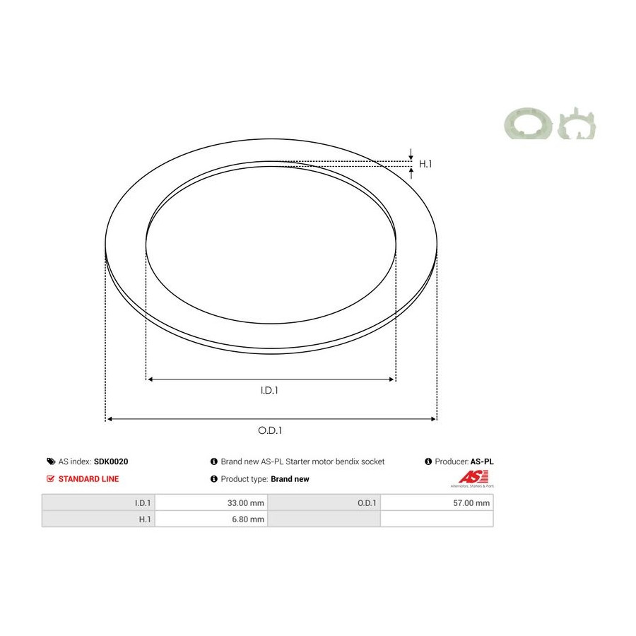 Outer diameter [mm] 57,00 Inner diameter 1 [mm] 33,00 Quality Standard line Warranty 2 years Height [mm] 6,80 New part without deposit -