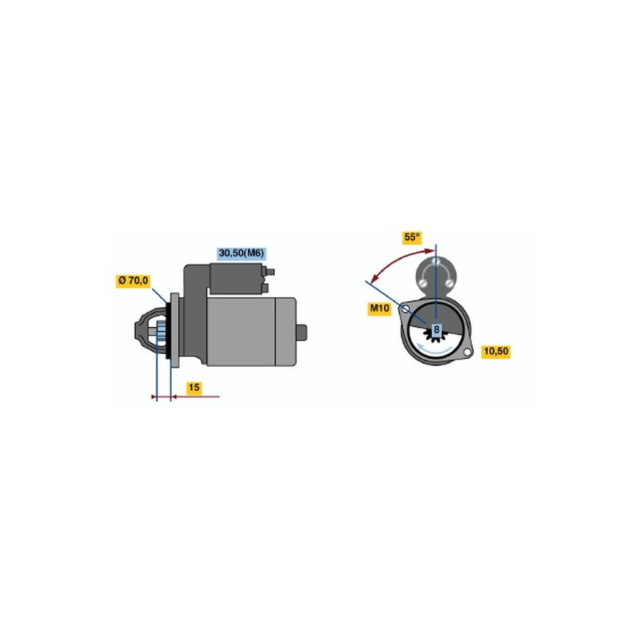 Number of Teeth 8 Rated Power [kW] 0,7 Number of mounting bores 1 Rotation Direction Clockwise rotation Voltage [V] 12 Thread Size M10x1.5 Position / Degree Left (passenger side) Clamp 30,50 Service exchange part Warranty 2 years Connecting Angle [Degree] 55 Number of Thread Bores 1 Length [mm] 195 Pinion start position [mm] 12 starter Version Without top bearing Jaw opening angle measurement [Degree] 135 Fastening hole angle measurement [Degree] 55 Flange diameter [mm] 70 Hole diameter 2 [mm] 11 Similar products of other manufacturers