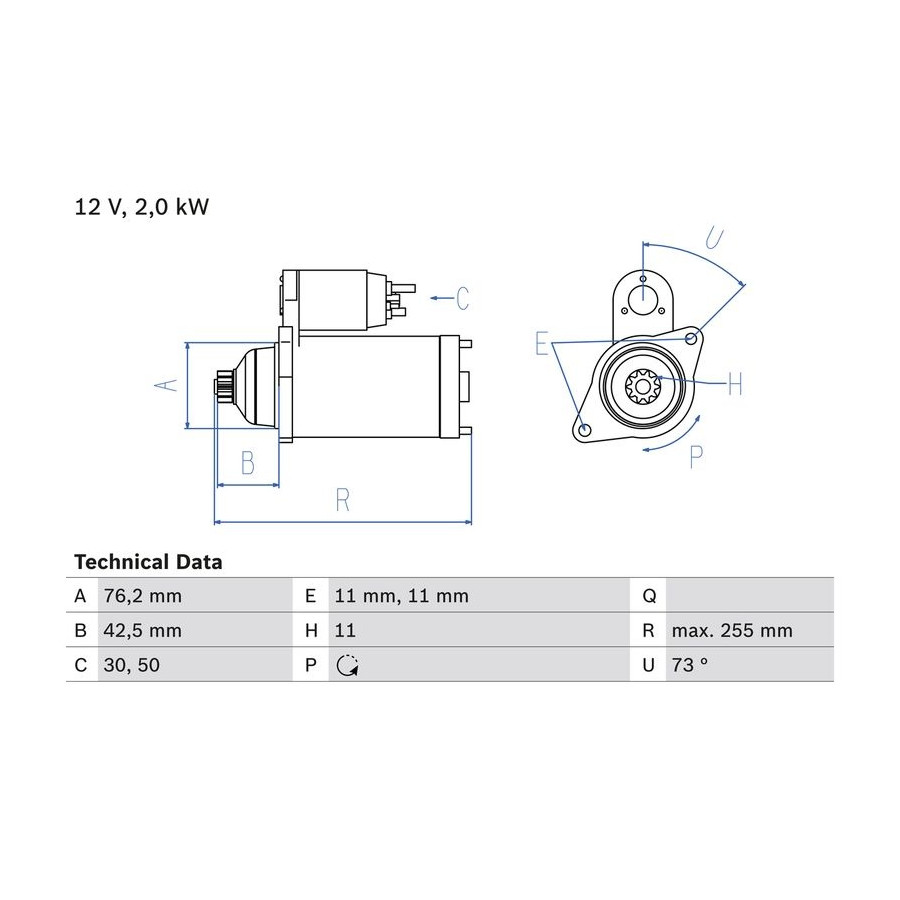 Number of Teeth 11 Rated Power [kW] 2 Number of mounting bores 2 Rotation Direction Anti-clockwise rotation Voltage [V] 12 Position / Degree Right (driver's side) Clamp 50 30 Service exchange part Warranty 2 years Connecting Angle [Degree] 73 Number of Thread Bores 0 Length [mm] 255 Pinion start position [mm] 42,5 starter Version Without top bearing (automatic) Fastening hole angle measurement [Degree] 73 Flange diameter [mm] 76,2 Hole diameter [mm] 11 Hole diameter 2 [mm] 11 Similar products of other manufacturers