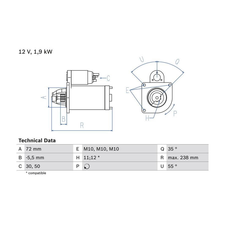 Number of Teeth 12 11 Number of mounting bores 0 Rotation Direction Clockwise rotation Starter motor power [kW] 1,9 Voltage [V] 12 Thread Size M10x1.5 Thread Measurement 1 M10x1.5 Position / Degree Left (passenger side) Clamp 30,50 Service exchange part Thread Measurement 2 M10x1.5 Warranty 2 years Connecting Angle [Degree] 55 Number of Thread Bores 3 Length [mm] 238 Pinion start position [mm] -5.5 starter Version Without top bearing Jaw opening angle measurement [Degree] 35 Fastening hole angle measurement [Degree] 55 Similar products of other manufacturers