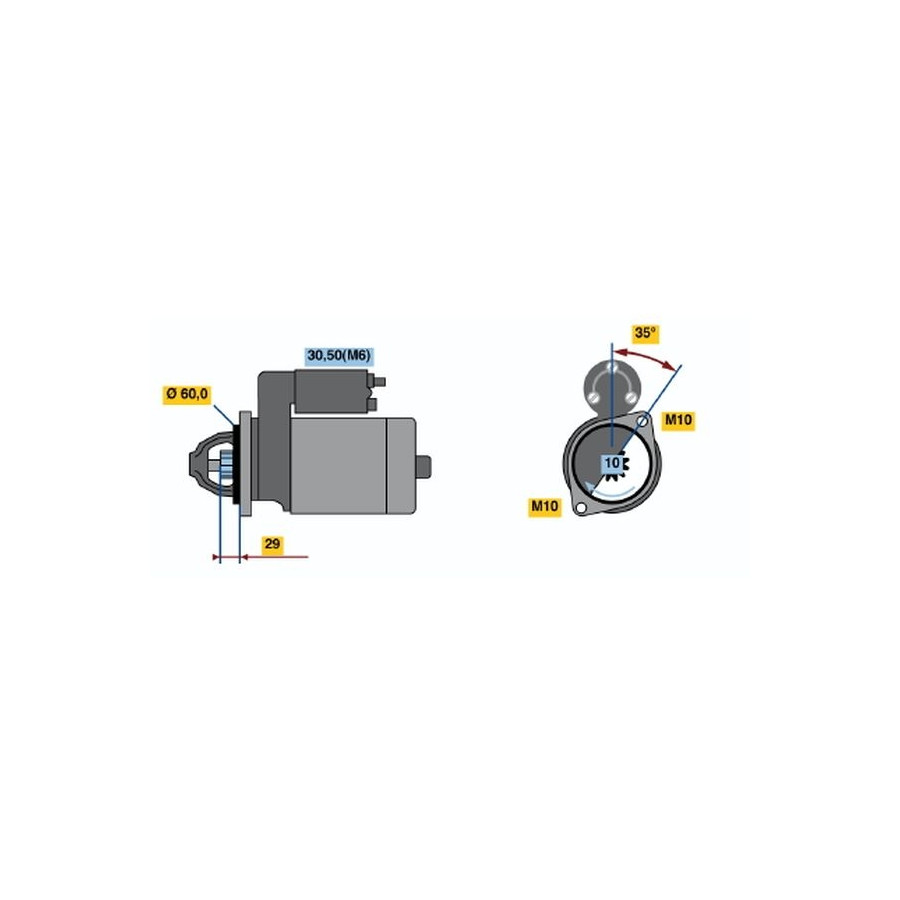Number of Teeth 10 Number of mounting bores 0 Rotation Direction Clockwise rotation Starter motor power [kW] 1,7 Voltage [V] 12 Thread Size M10 Thread Measurement 1 M10x1.5 Position / Degree Right (driver's side) Clamp 50 30 Warranty 2 years Connecting Angle [Degree] 35 Number of Thread Bores 2 Length [mm] 254,5 Pinion start position [mm] 26 starter Version Without top bearing Jaw opening angle measurement [Degree] 35 Fastening hole angle measurement [Degree] 35 Flange diameter [mm] 60 Similar products of other manufacturers