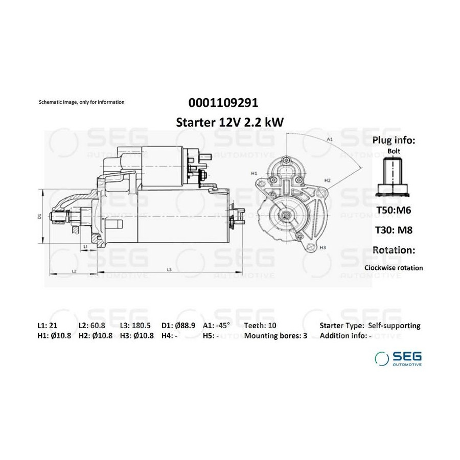 Number of Teeth 10 Number of mounting bores 3 Rotation Direction Clockwise rotation Starter motor power [kW] 2,2 Voltage [V] 12 Position / Degree L45 Clamp T50: M6; T30: M8 Plug Type ID Bolt Warranty 2 years application Vehicle specific Length [mm] 241,3 Category Engine parts and accessories Flange diameter [mm] 89 -