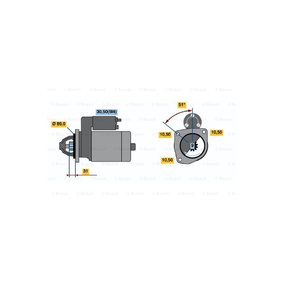 Number of Teeth 9 Rated Power [kW] 4 Number of mounting bores 3 Rotation Direction Clockwise rotation Voltage [V] 24 Bore Ø 3 [mm] 10,5 Position / Degree Left (passenger side) Clamp 50 30 Warranty 2 years Connecting Angle [Degree] 51 Number of Thread Bores 0 Length [mm] 317 Pinion start position [mm] 28 starter Version Without top bearing Jaw opening angle measurement [Degree] 39 Fastening hole angle measurement [Degree] 51 Flange diameter [mm] 89 Hole diameter [mm] 10,5 Hole diameter 2 [mm] 10,5 Similar products of other manufacturers