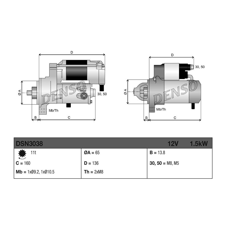 Number of Teeth 11 Rotation Direction Clockwise rotation Starter motor power [kW] 1,5 Voltage [V] 12 Quality Denso Warranty 2 years Gross weight [g] 4080 New part without deposit Similar products of other manufacturers