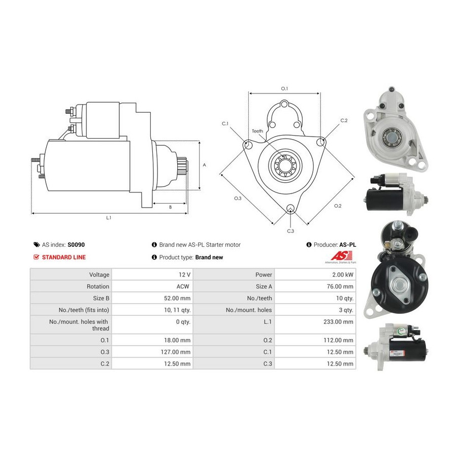 Number of Teeth 10 Number of mounting bores 3 Rotation Direction Anti-clockwise rotation Starter motor power [kW] 2 Voltage [V] 12 for OE number 0001123012 Quality Standard line Warranty 2 years New part without deposit Similar products of other manufacturers