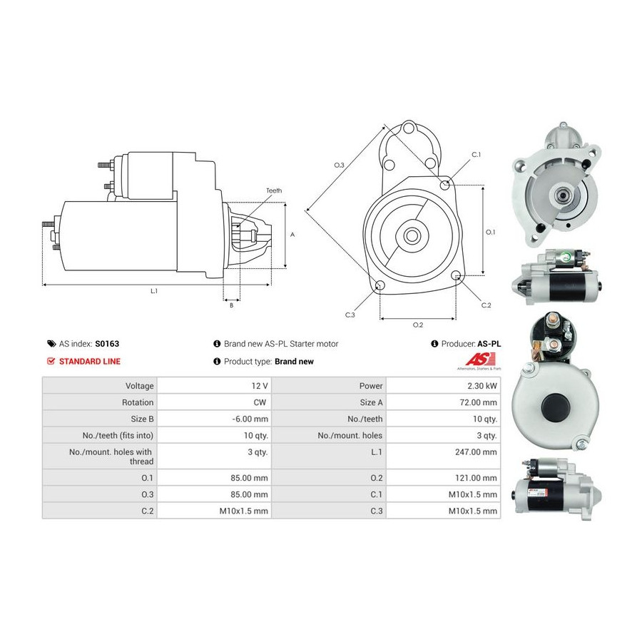 Number of Teeth 10 Number of mounting bores 3 Rotation Direction Clockwise rotation Starter motor power [kW] 2,3 Voltage [V] 12 for OE number 0001223014 Quality Standard line Warranty 2 years New part without deposit Similar products of other manufacturers