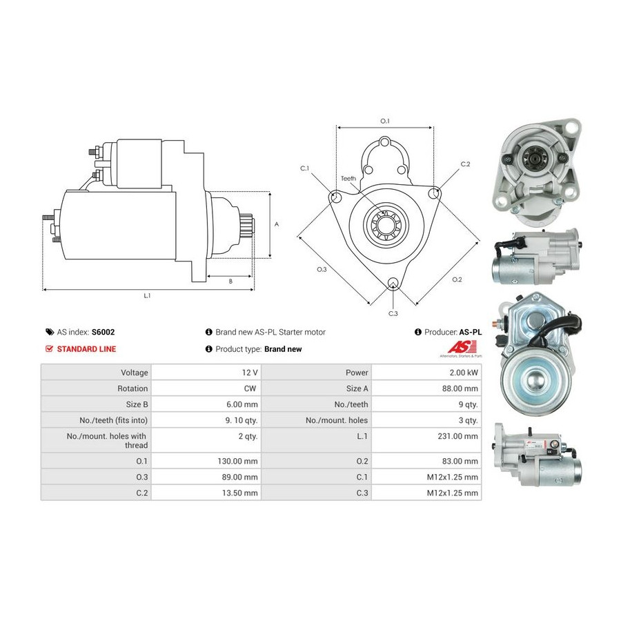 Number of Teeth 9 Number of mounting bores 3 Rotation Direction Clockwise rotation Starter motor power [kW] 2 Voltage [V] 12 for OE number 1280000040 Quality Standard line Warranty 2 years New part without deposit Similar products of other manufacturers