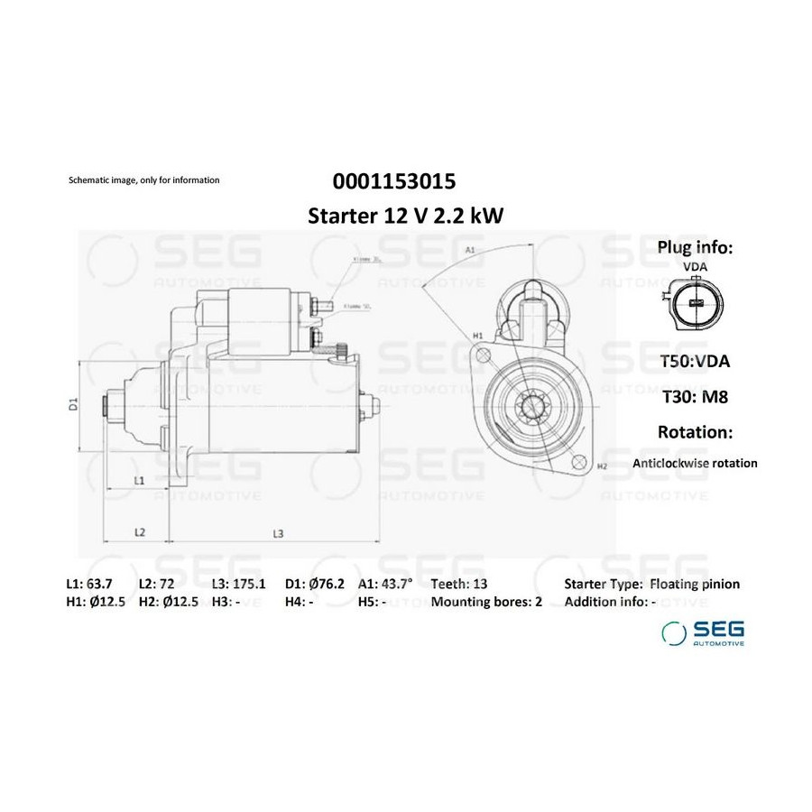 Number of Teeth 12 Rated Power [kW] 2,2 Number of mounting bores 2 Rotation Direction Anti-clockwise rotation Voltage [V] 12 Position / Degree R43,7 Clamp T50: VDA; T30: M8 Plug Type ID VDA Warranty 2 years Length [mm] 247,1 Flange diameter [mm] 76 Similar products of other manufacturers