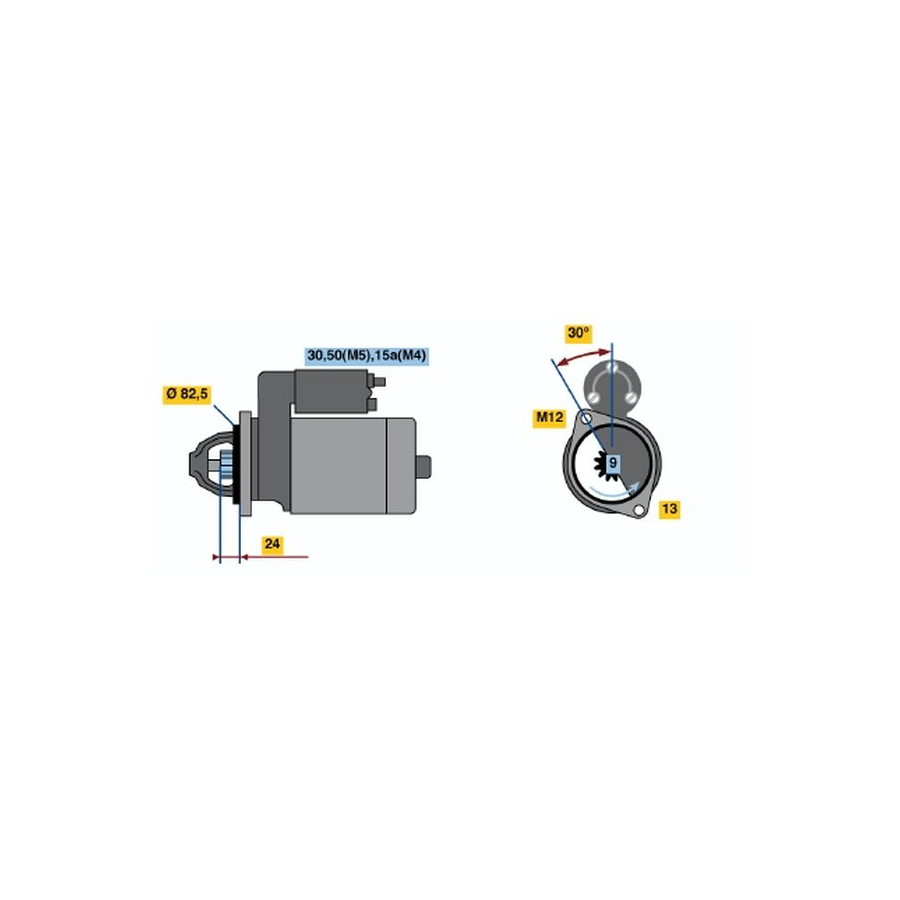 Number of Teeth 9 Number of mounting bores 1 Rotation Direction Anti-clockwise rotation Starter motor power [kW] 1,4 Voltage [V] 12 Thread Size M12 Position / Degree Left (passenger side) Clamp 30 50 15A Warranty 2 years Connecting Angle [Degree] 30 Number of Thread Bores 1 Length [mm] 245 Pinion start position [mm] 21 starter Version Without top bearing Jaw opening angle measurement [Degree] 165 Fastening hole angle measurement [Degree] 30 Flange diameter [mm] 82,5 Hole diameter 2 [mm] 13 -