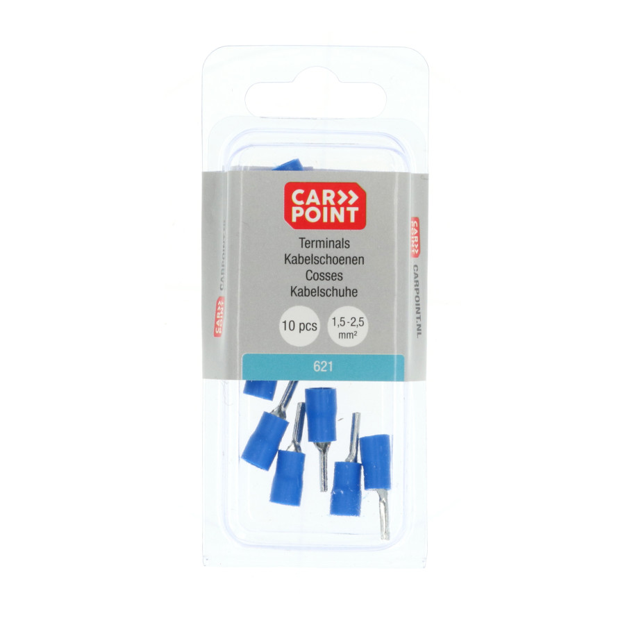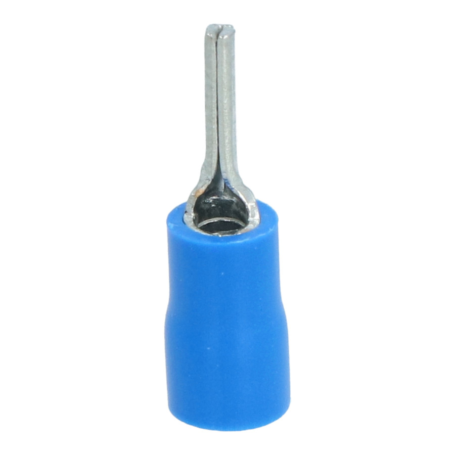 Blue Carpoint partially insulated pin terminal lug 621. The pin has a diameter of 1.9mm. Suitable for a wire cross-section of 1.5-2.5mm² . The terminal lug is 13mm long. Pin terminal lugs are also used for clamp connections. However, the pins are mechanically stronger. The conductor diameter tapers with the pin, allowing smaller clamp connections to be operated using these terminal lugs.
