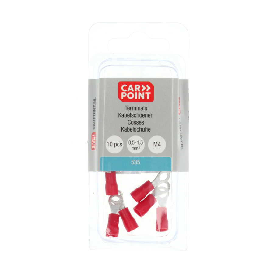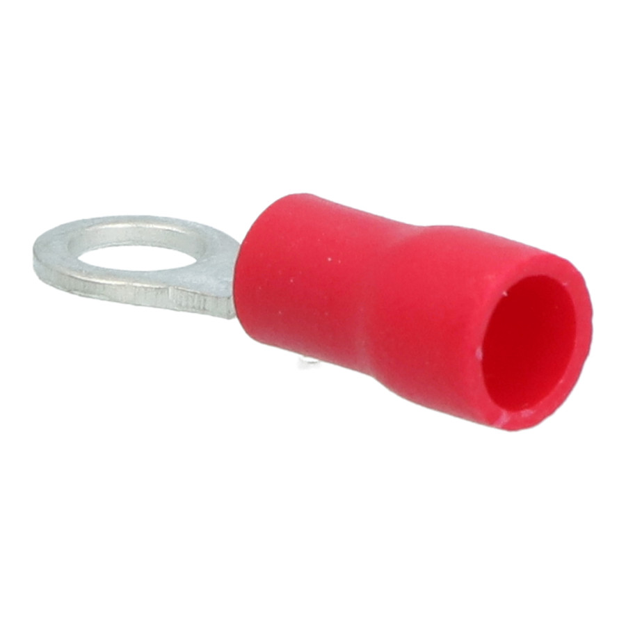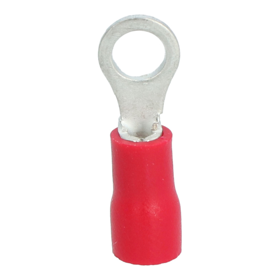Red Carpoint partially insulated M4 ring cable lug 535. The inner ring diameter is 4.3mm. Suitable for a wire cross-section of 0.5-1.5mm². The cable lug is 20mm long. These cable lugs clamp the wires under screw heads. The ring cable lugs are designed for very fine-stranded conductors. They are typically used for smaller cross-sections.