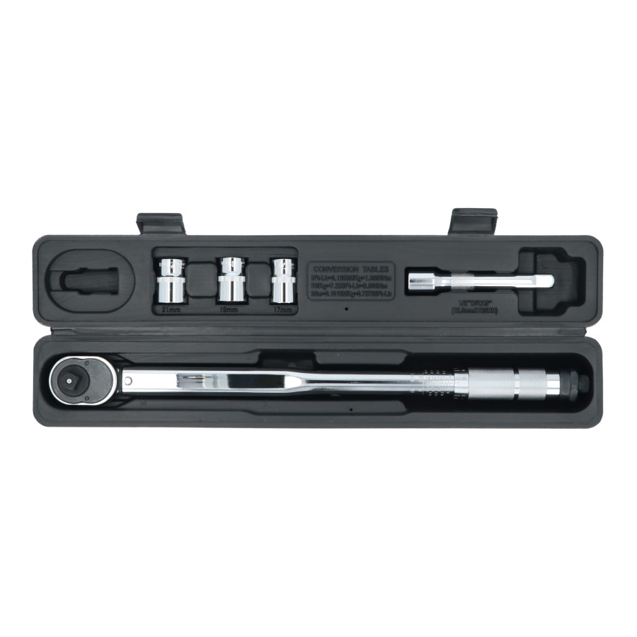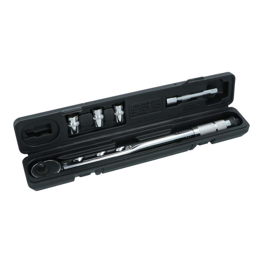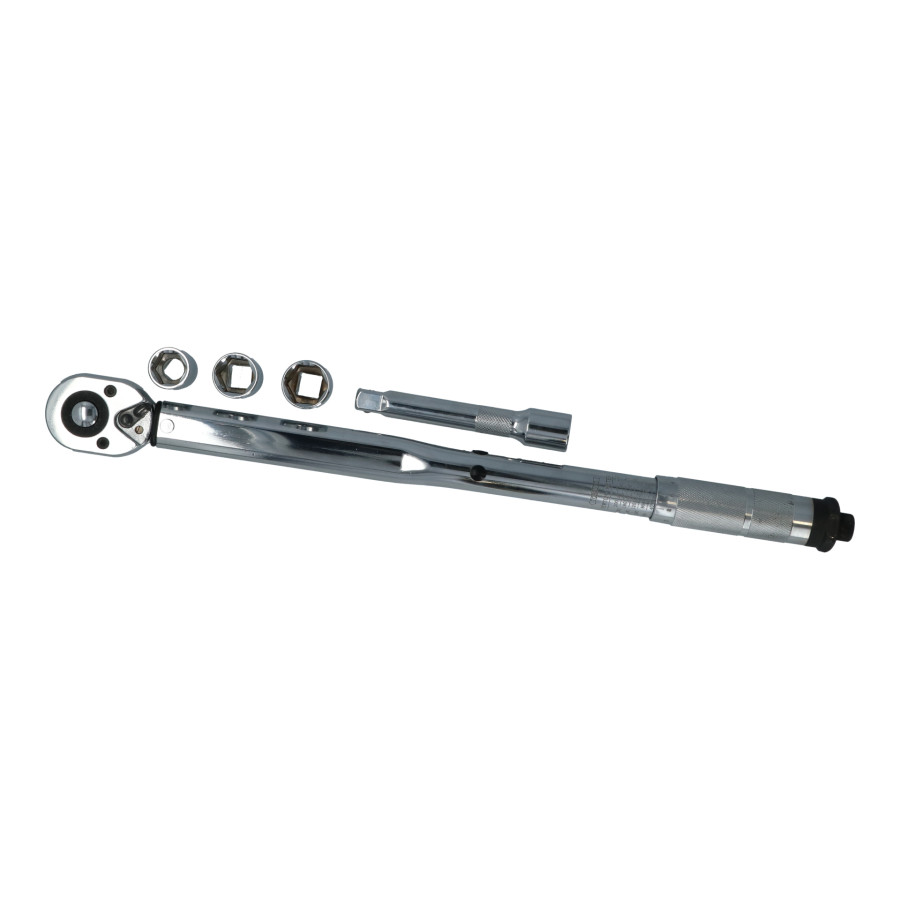 5-piece Carpoint torque wrench set with a 465mm torque wrench, a 125mm 1/2" extension, and three different sockets in sizes 17, 19, and 21mm. The Carpoint torque wrench allows you to tighten bolts to a precise preset torque. A click signal sounds when the torque is reached.