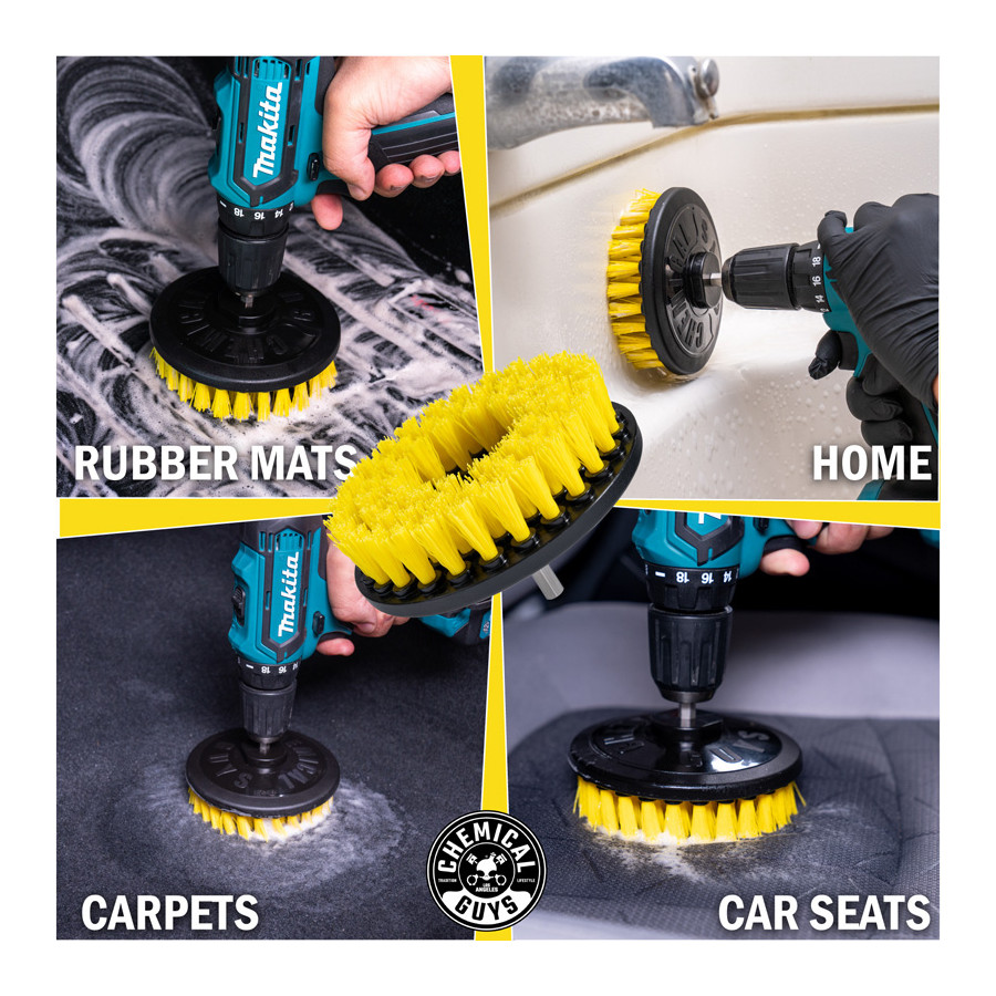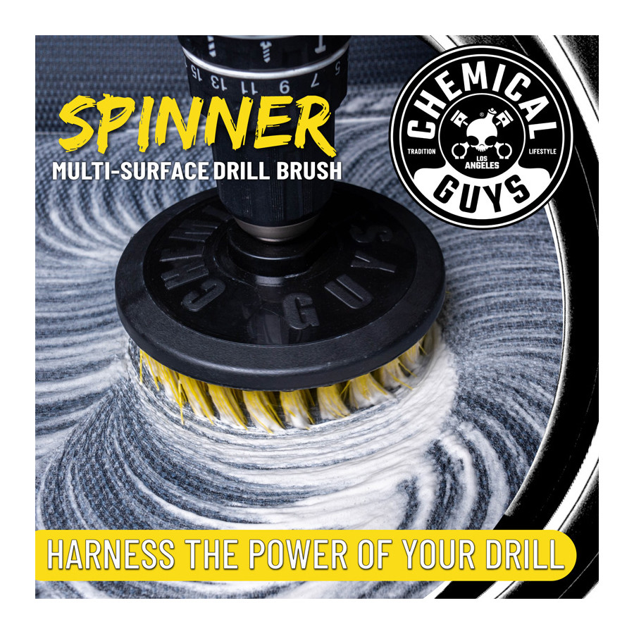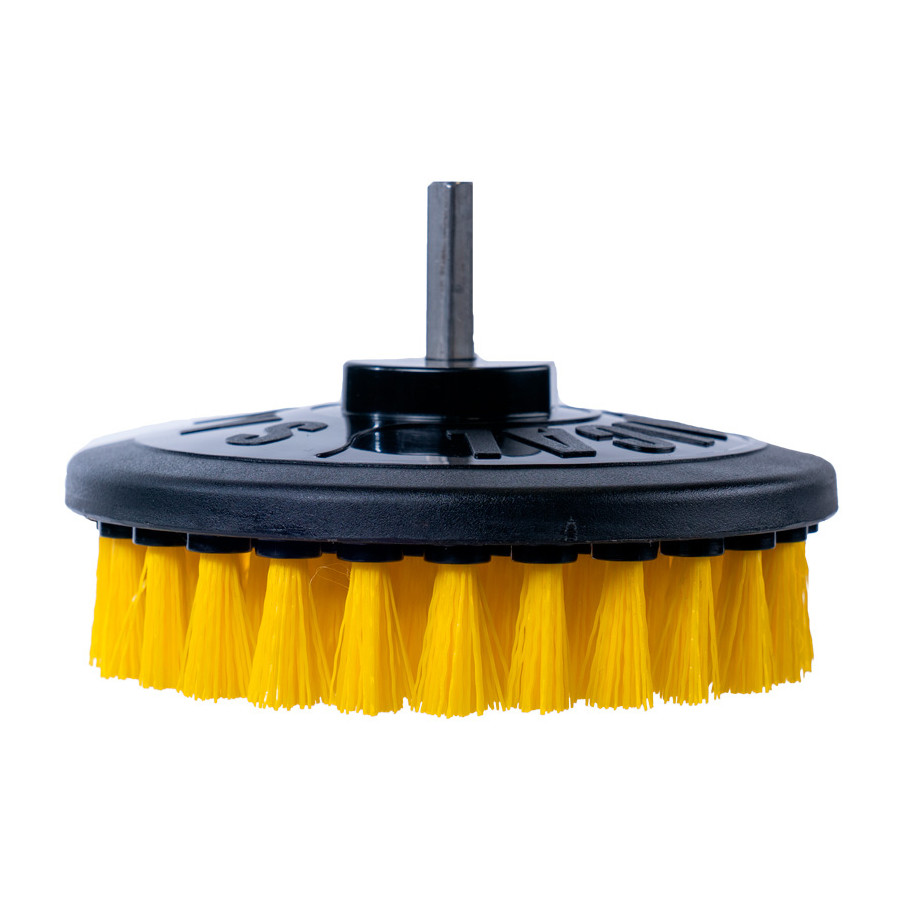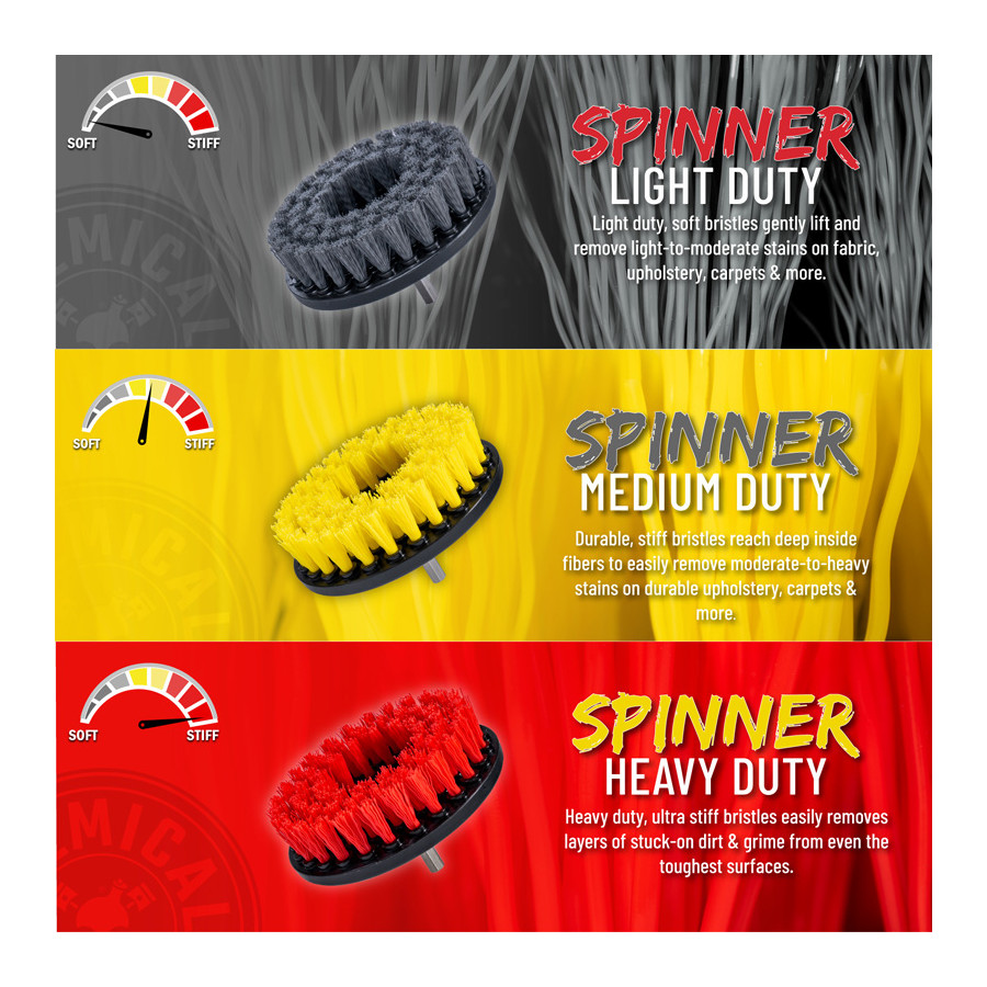 The Medium Duty Spinner Multi-Surface Drill Brush is a versatile attachment for your drill that provides the fastest, most dynamic, and most efficient way to remove moderate to heavy stains from car mats, soft plastics, rubber, and upholstery.
