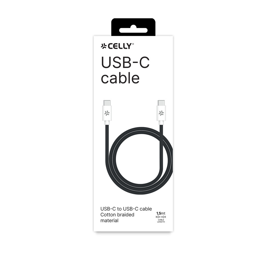 This black 1.5 meter Celly charging cable with USB-C connectors is made of woven fabric for more strength and durability. Unlike standard rubber cables, braided fabric cables are much more resistant to wear and are harder to tangle. Equipped with two USB-C connectors, they can be used to charge both Android smartphones and the latest iPhone 15. And in the case of the iPhone, they are available in different colors, matching the color of the new Apple models. They support fast charging up to 100W and are compatible with all chargers and power banks equipped with a USB-C port. The package also includes a rip-tab strap to roll up your cable and store it neatly when not in use.