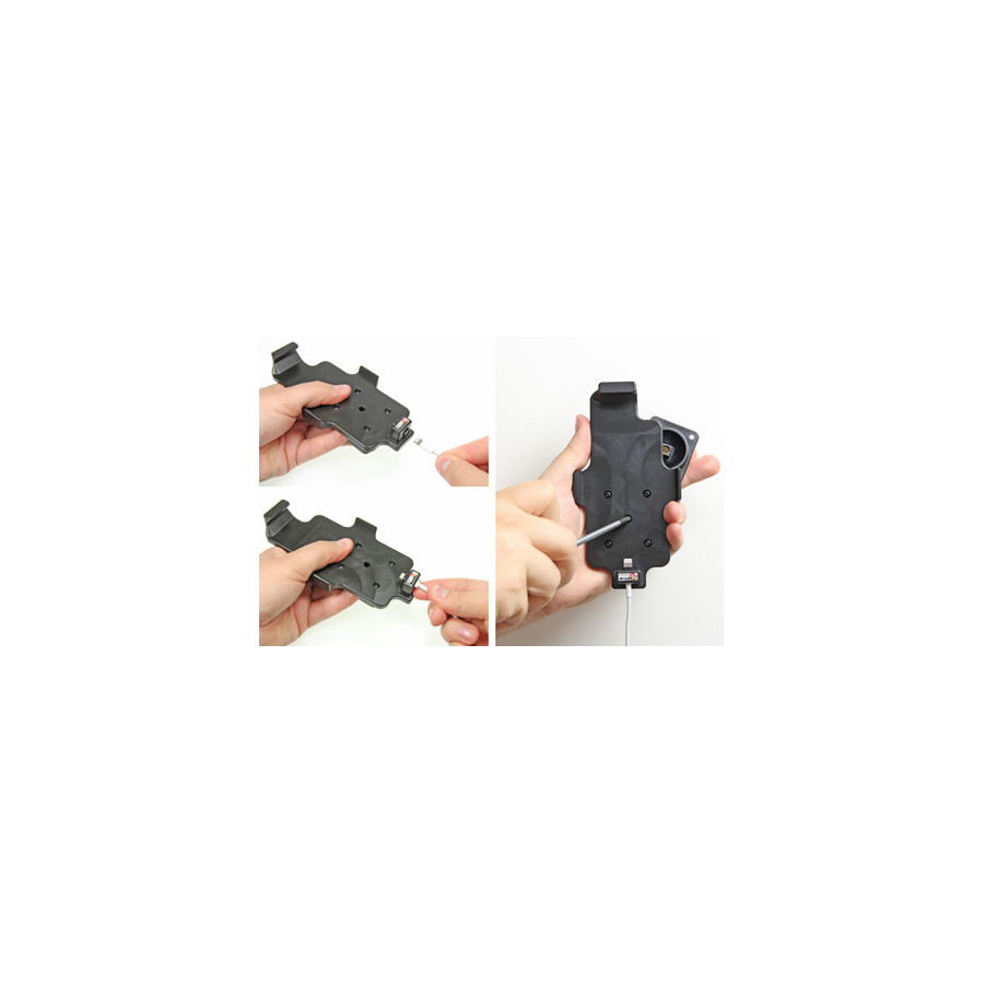 For use with Apple's original Lightning to USB cable. With tilt swivel. Suitable for devices with a skin with the following dimensions: Height: 137-144 mm, Width: 75 mm, Thickness: 2-11 mm.