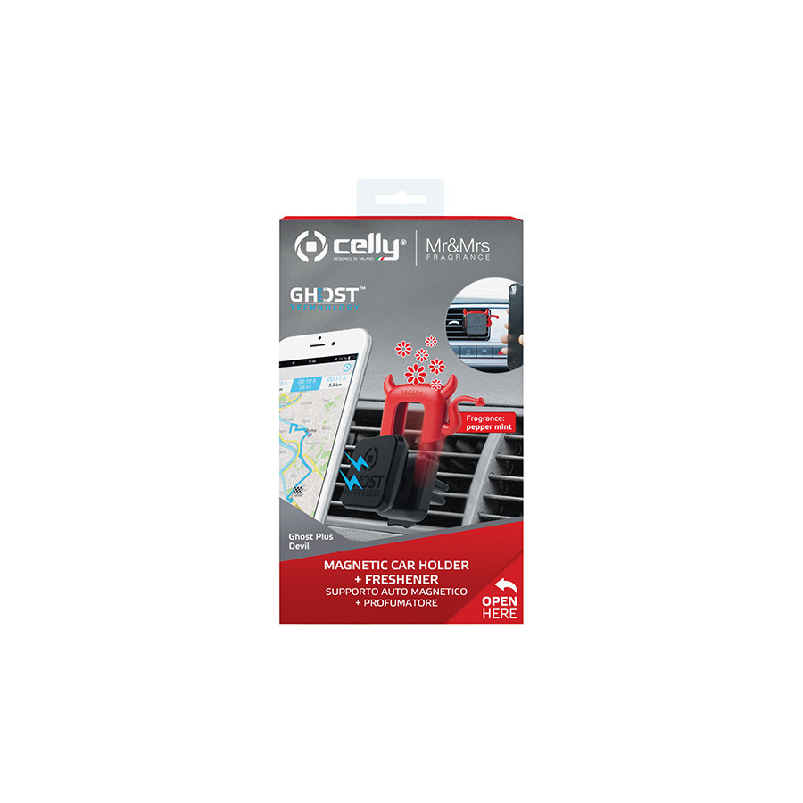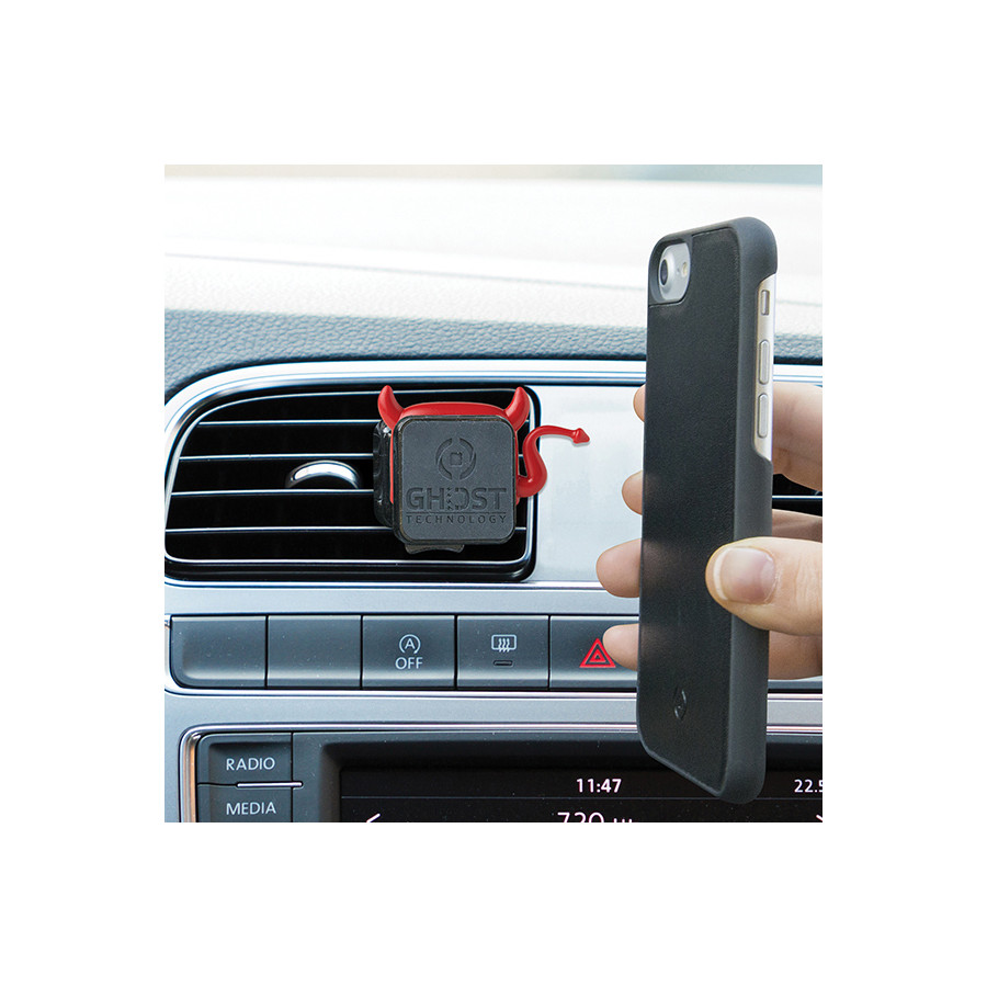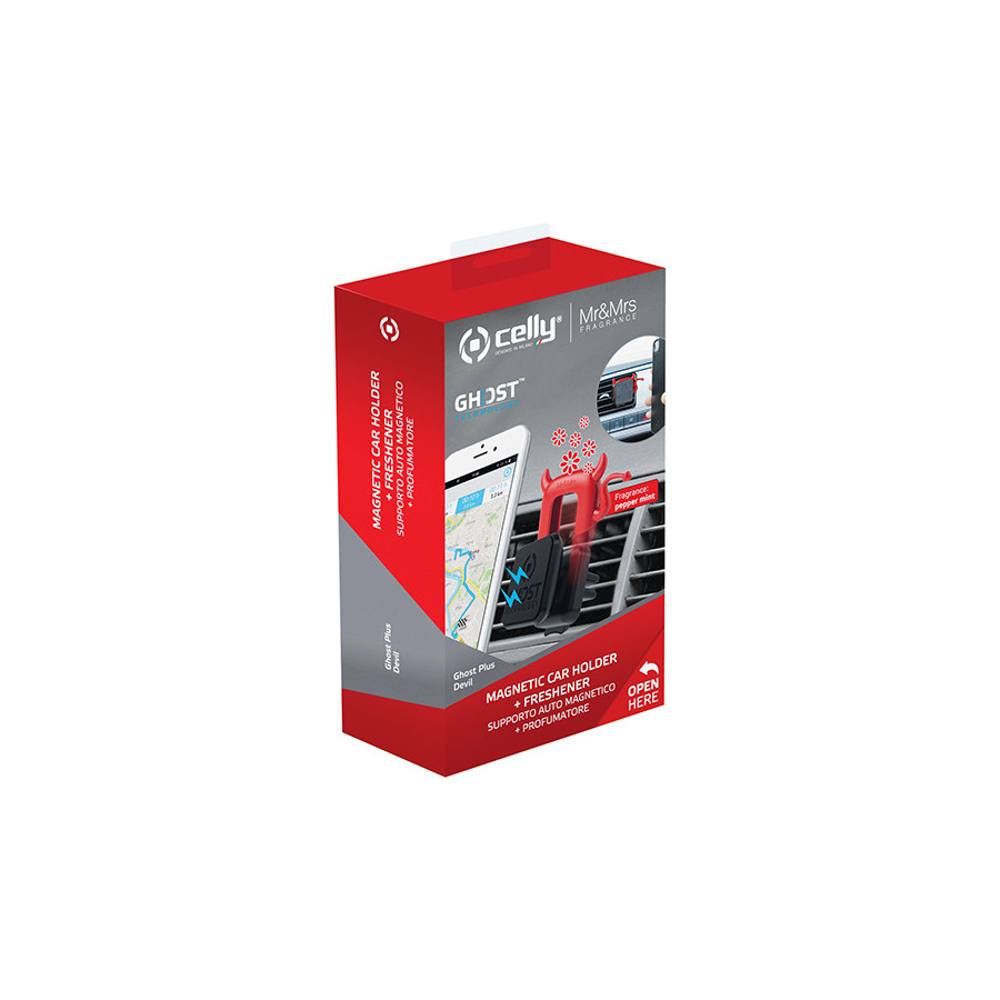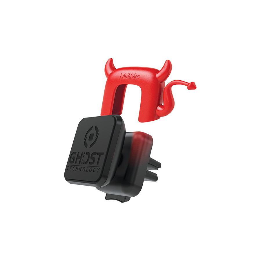 The Celly Ghost Plus is a universal ventilation grille holder with magnetic mounting system, suitable for smartphone, navigation system or MP3 player. The holder can easily be clamped in the ventilation grille and unlocked with the push button. The supplied metal plate is glued to a smooth flat surface of the device or to the protective cover. This makes the device easy to clamp to the magnetic holder. The magnetic mount does not affect the operation of your electronic device. The holder can be rotated 360 degrees, so the device can be used both horizontally and vertically. The rubber protective layer on the holder prevents damage. The Ghost Plus comes with two metal mounting plates so that multiple devices can be used on the Ghost.