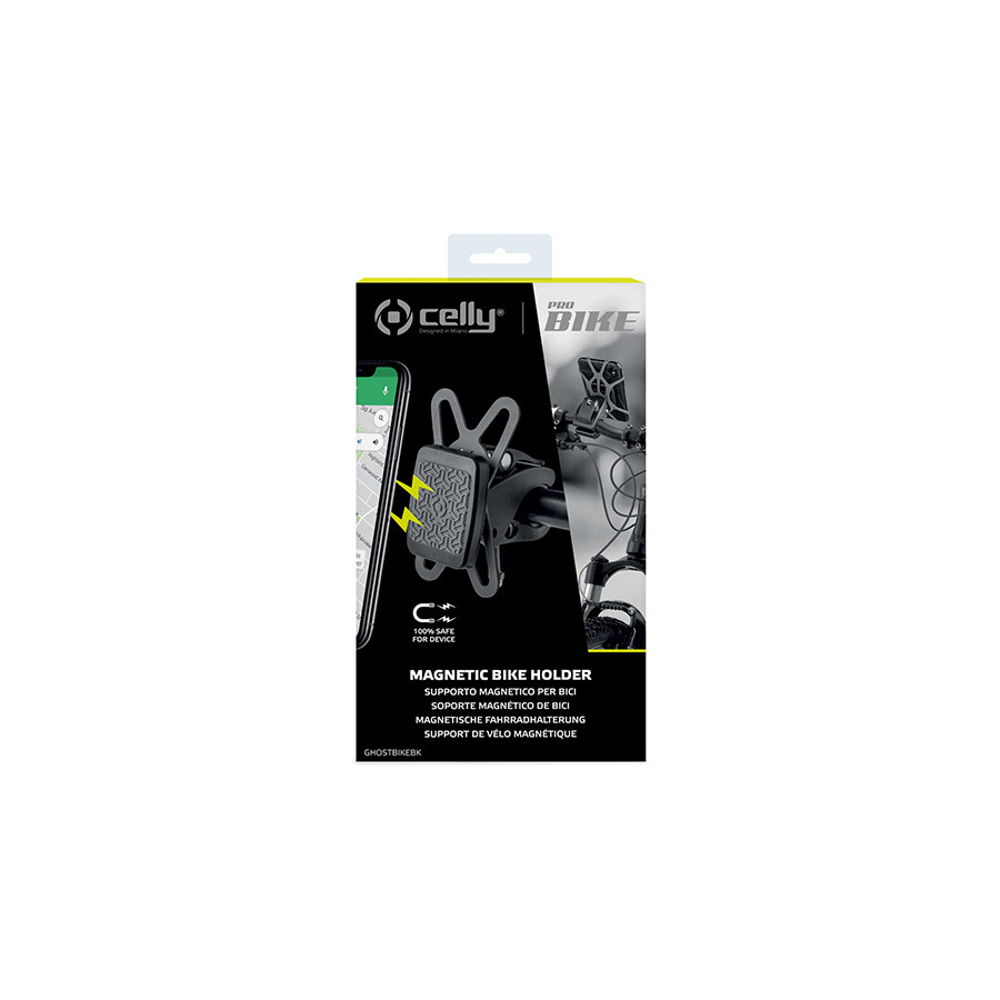 The Celly GhostBike is the magnetic phone holder for your daily travel and sports activities. The ultra-strong magnets and the anti-slip grip silicone base provide the best stability for your smartphone. The elastic mounting system is easy to install and provides a secure hold for all smartphone models during use. The adjustable clamp, which is compatible with all handlebars up to 3.5 cm in diameter, guarantees maximum resistance to shock and vibration in any situation. The box contains two metal adhesive plates that can be applied to the back of the smartphone, to the MP3 player or in the back of the case.