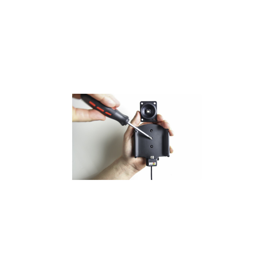 The holder is equipped with a tilt hinge, so you can easily adjust the angle for a better view or switch between portrait and landscape mode. Tilts 20° and rotates 360°. Mounting plate 42x50mm with pre-drilled AMPS holes + centered 2.5mm holes. Made of high quality black ABS/Acetal plastic. Made in Sweden. Attaches to the ProClip mounting platform.