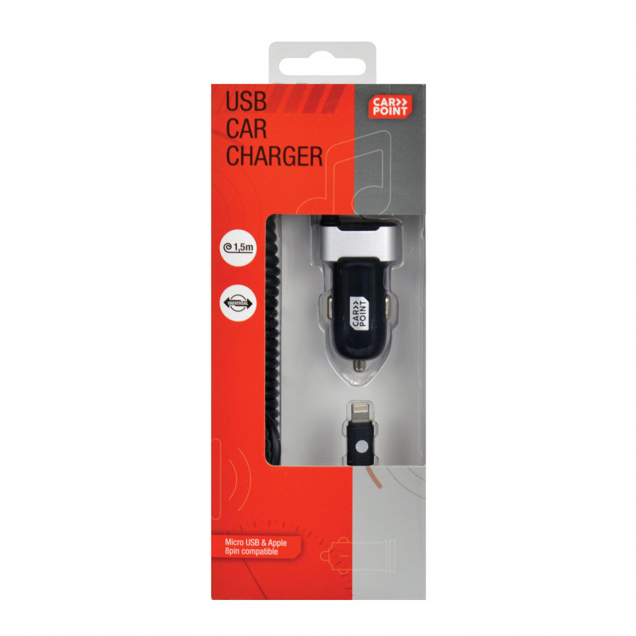 The Carpoint 12/24 Volt 8 Pin car charger ensures that you can charge a device with 8-pin and all Micro USB devices while you are driving. The extra USB output makes it possible to charge two devices at the same time. The USB charger has a USB 2.4A port for fast charging. Carpoint cable has a length of approximately 120cm.