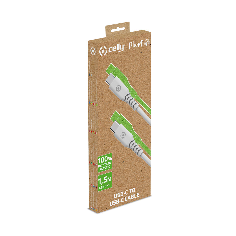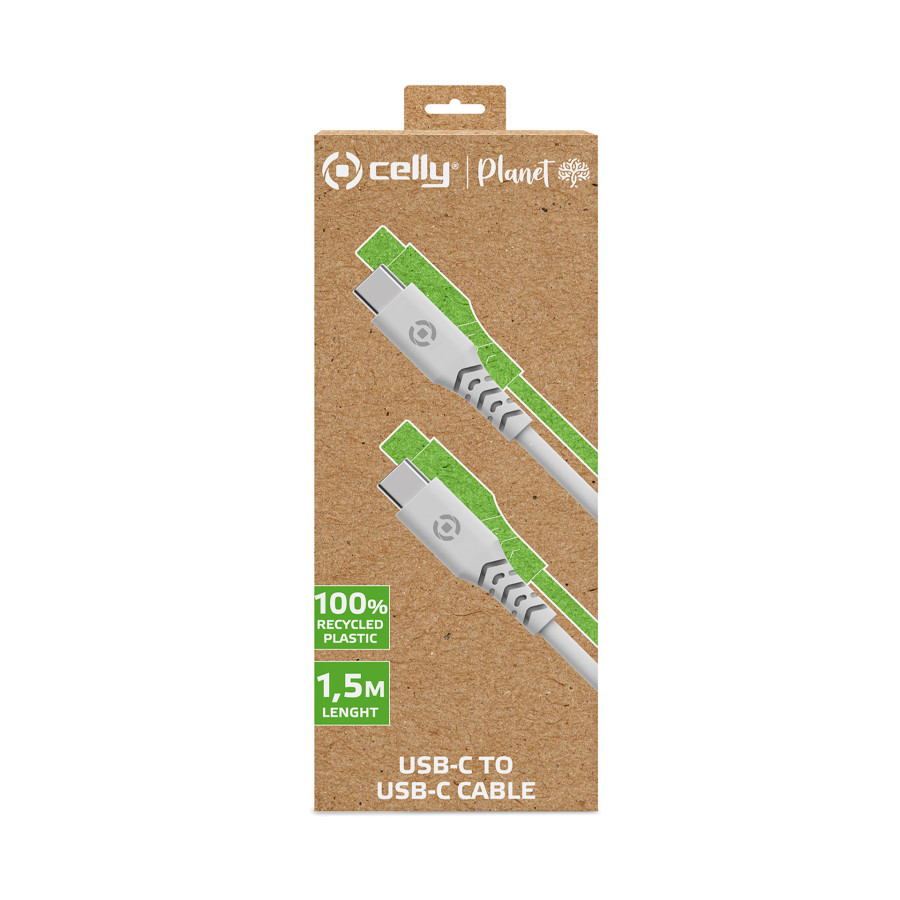 Celly Planet USB-C > USB-C 1.5-meter eco-friendly charging cable made from 100% recycled plastic. Looking for an environmentally friendly way to charge your favorite electronic devices with a USB-C port? The Celly Planet charging cable is the perfect choice. This cable is made entirely of high-quality recycled plastic, so you can power your devices while helping to protect the environment. This charging cable is a step forward in reducing plastic waste. The recycled plastic used for the cable is highly durable, ensuring a long lifespan and a stable connection during charging. The cable is equipped with all the necessary protections and certifications to ensure the safety of your device while charging.