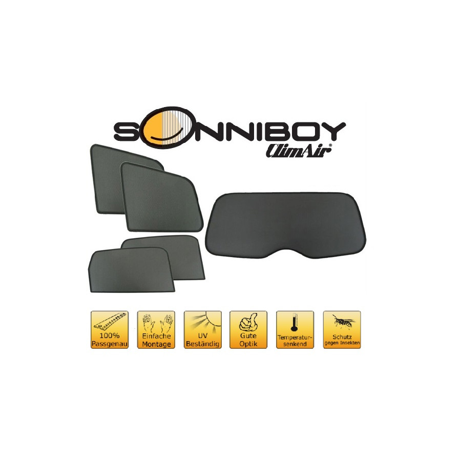 Sonniboy sunshades are perfect during beautiful summer weather, long holiday trips and especially for your passengers. These sunshades keep the bright sun out and the specially woven fabric structure gives your car a nice discreet appearance, your windows get the look of blinded windows.