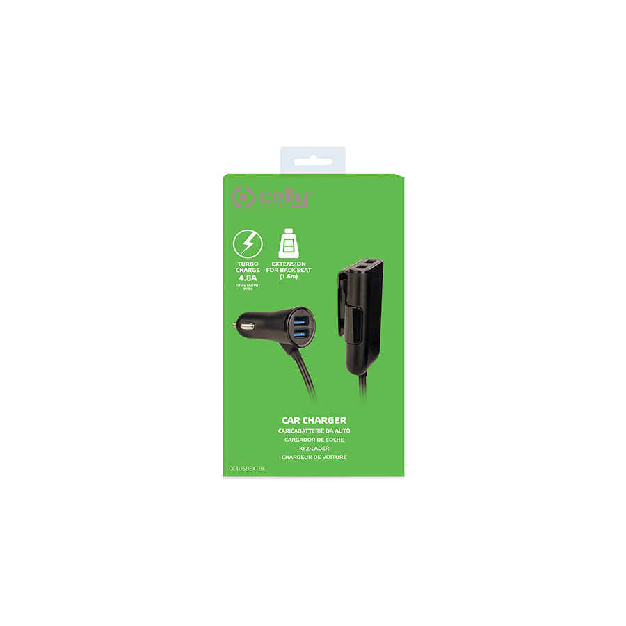 Celly car charger with 4 USB ports to quickly charge up to 4 devices simultaneously, ideal for trips with friends and family. The charger is equipped with 2 USB ports on the front and an extension (1.6 meters) with 2 other USB ports for the rear seat, so that all passengers can easily charge their devices. The practical clip on the adapter allows you to attach the charger to the back of the seat.