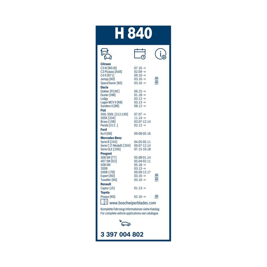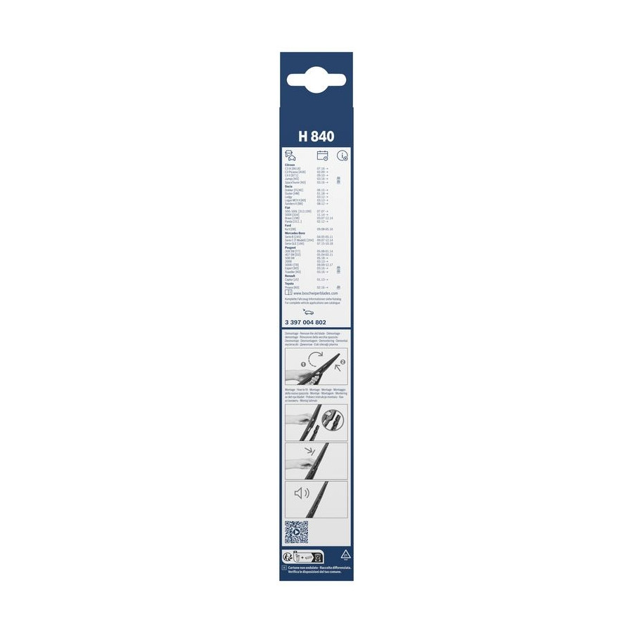 Super quality as you would expect from Bosch. Replace within 5 minutes. Delivered promptly and well packaged.